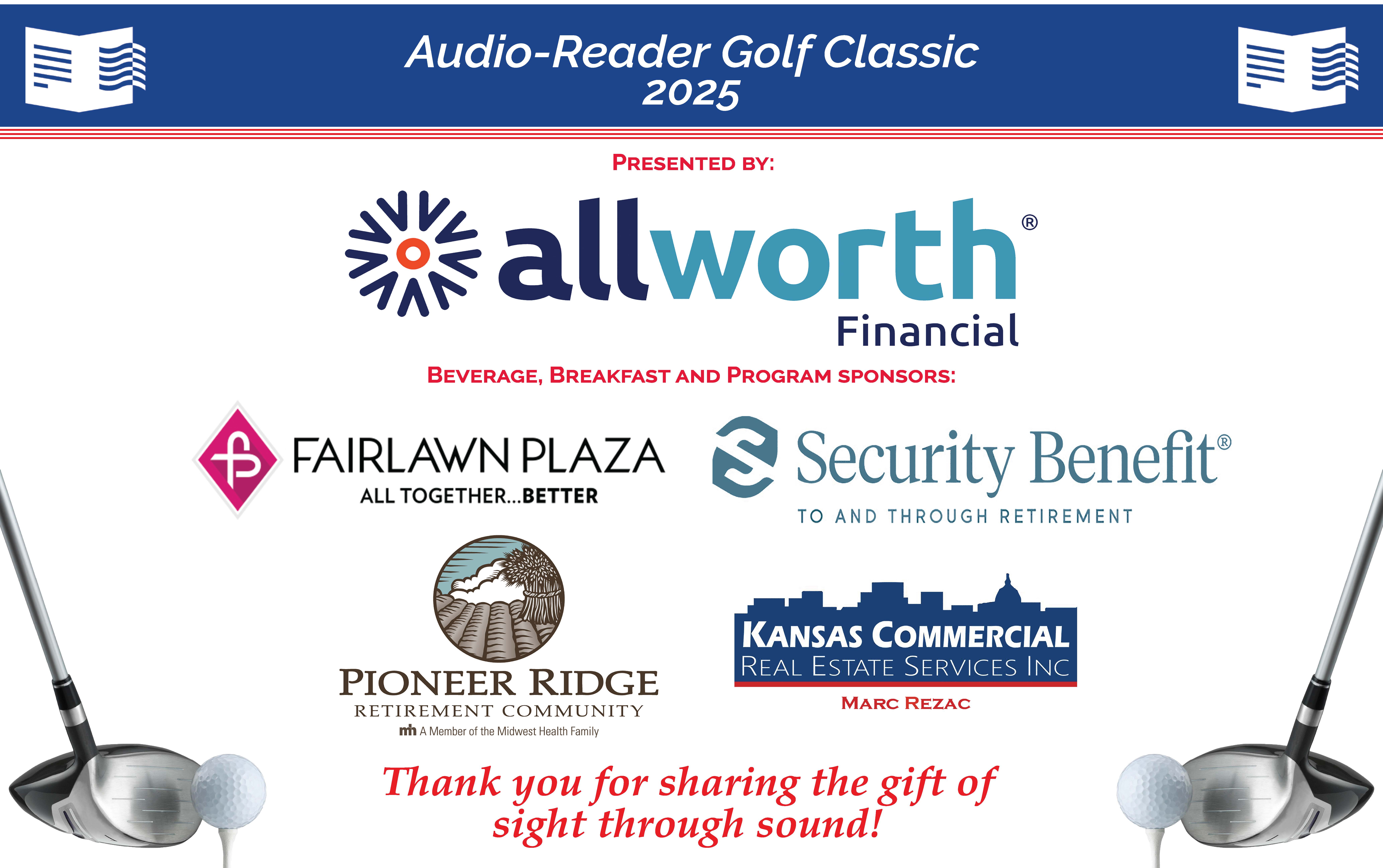 The 15th Annual Golf Classic, held on June 9th, 2025, at the Eagle Bend Golf Course, was a tremendous success, grossing $38,000 for Audio-Reader! KU Football Assistant Coach - Running Backs, Jonathan Wallace, kicked off the event with inspiring words for participants. Golfers enjoyed competing in the 'Beat the Coach' challenge with KU Women's Golf Coach Lindsay Kuhle, along with many other fun competitions along the course. A highlight from the day was hearing from Mary Chappel, an Audio-Reader listener, who shared firsthand the impact of the service for people who are blind or visually impaired.