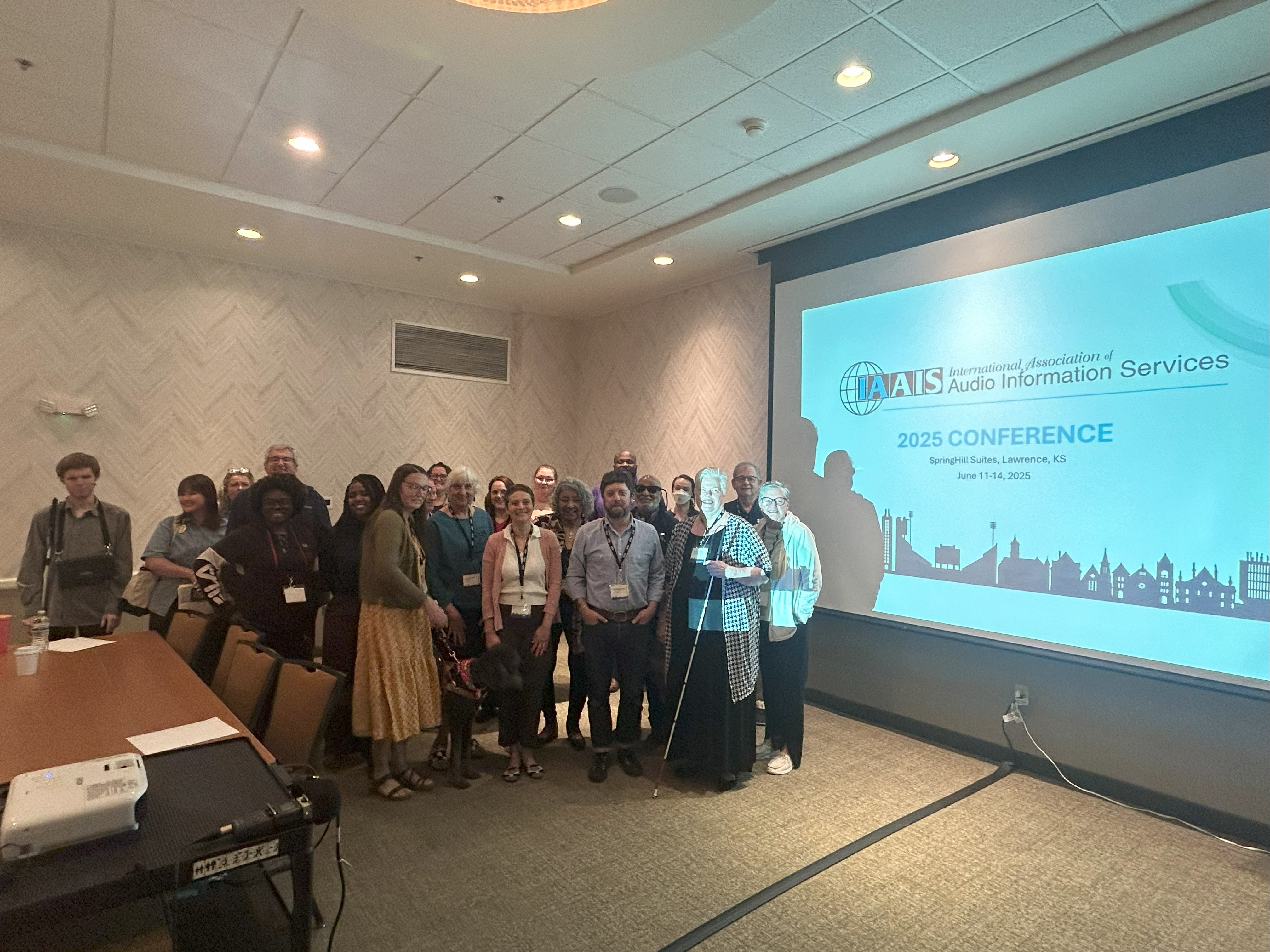 Task members Evan Starnes and Penn Street from Aftersight, Neva Fairchild from Experts on Blindness, Mike Duke of Mississippi, and Ryan Obradovich from Nebraska stand with Audio-Reader staff members Feloniz Lovato-Winston, Beth McKenzie, Colin Haliburton, and Caroline Blanke and 12 other IAAIS members.
